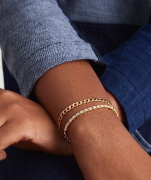 There’s nothing like capturing that ping of sparkle from diamond. Here’s that ping multiplied for an investment piece that’ll induce gasps for decades to come. Handcrafted in 14k solid gold featuring responsibly sourced diamonds. To put on the bracelet, insert the tongue into the clasp until you hear a “click.” Then, clip the safety arms down on both sides of the clasp to secure the bracelet. To take it off, unclip and pull the two horizontal safety arms away from the sides of the clasp. Then, press the thin vertical button to release the inner tongue.